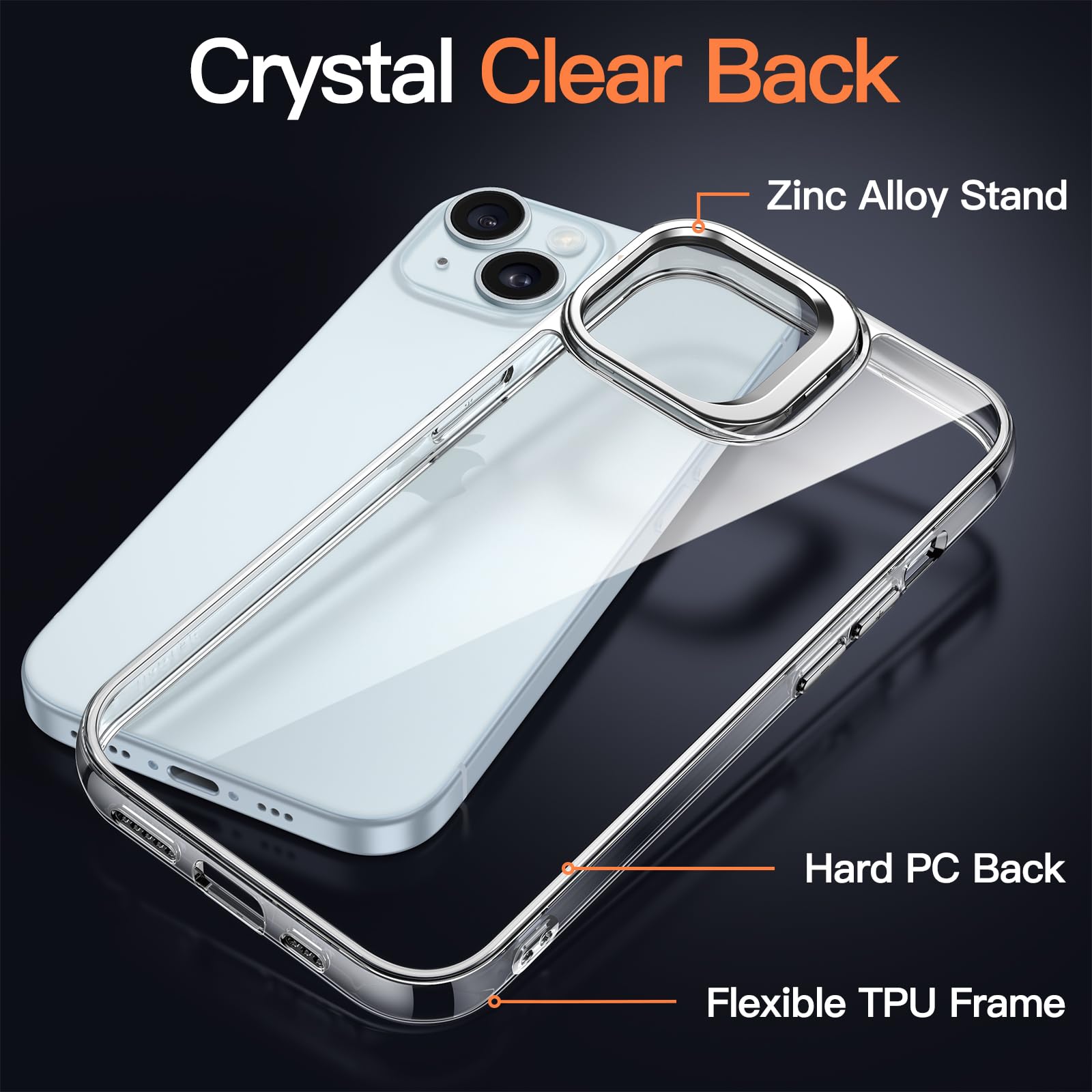 [Built-in Stand] Especially designed for iPhone 15 6.1-inch. Non-yellowing clear case with built-in camera ring stand. Also support wireless charging