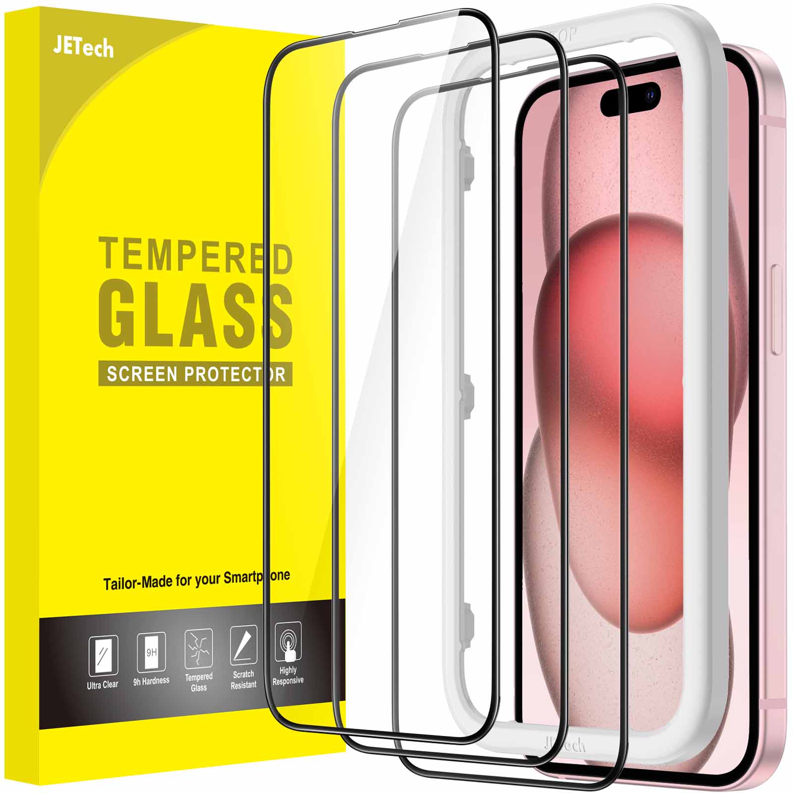 JETech Full Coverage Screen Protector for iPhone 15 Plus 6.7-Inch, Black Edge Tempered Glass Film with Easy Installation Tool, Case-Friendly, HD Clear, 3-Pack
