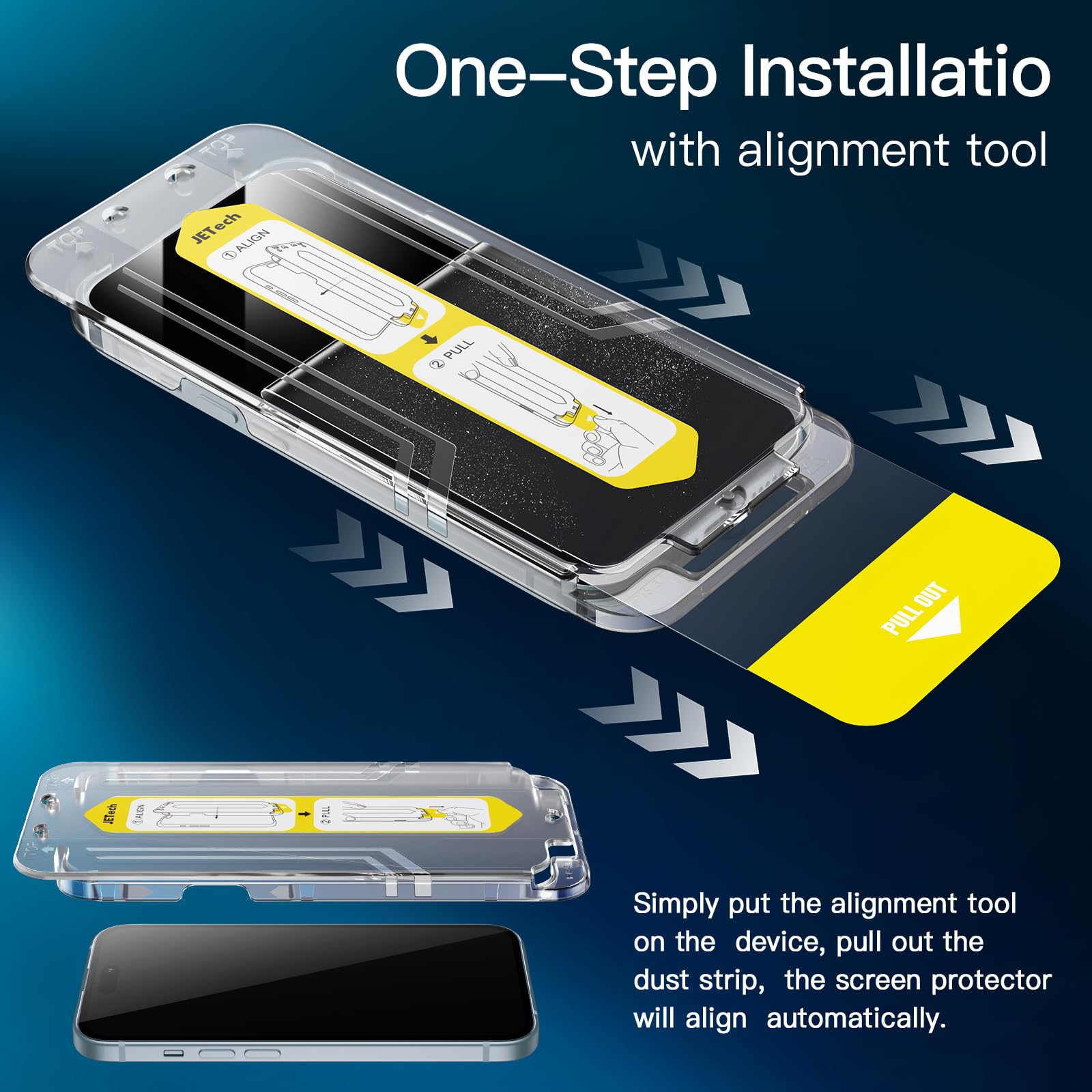 [One-Step Installation] Simply put the alignment tool on the device, pull out the dust strip, the screen protector will align automatically. No more worry about dust and air bubbles