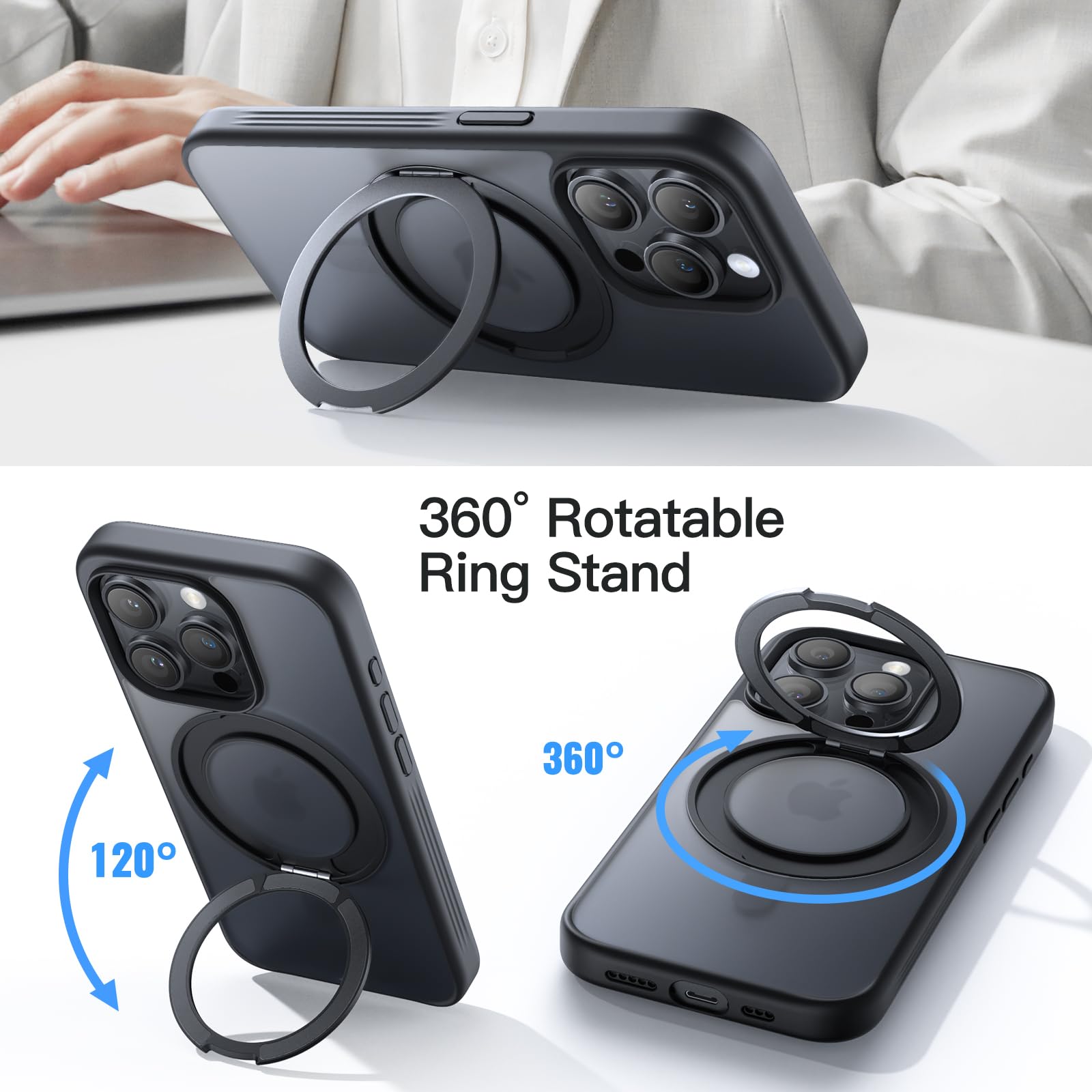 • [360 Degree Rotatable Ring Stand] The case has 360 degree rotatable ring stand that prop up various vertical and horizontal positions and you can adjust the angle as per your daily needs. The rotating magnetic ring uses a unique mechanical gear design which also offer you a fidget toy experience, relieving stress and anxiety