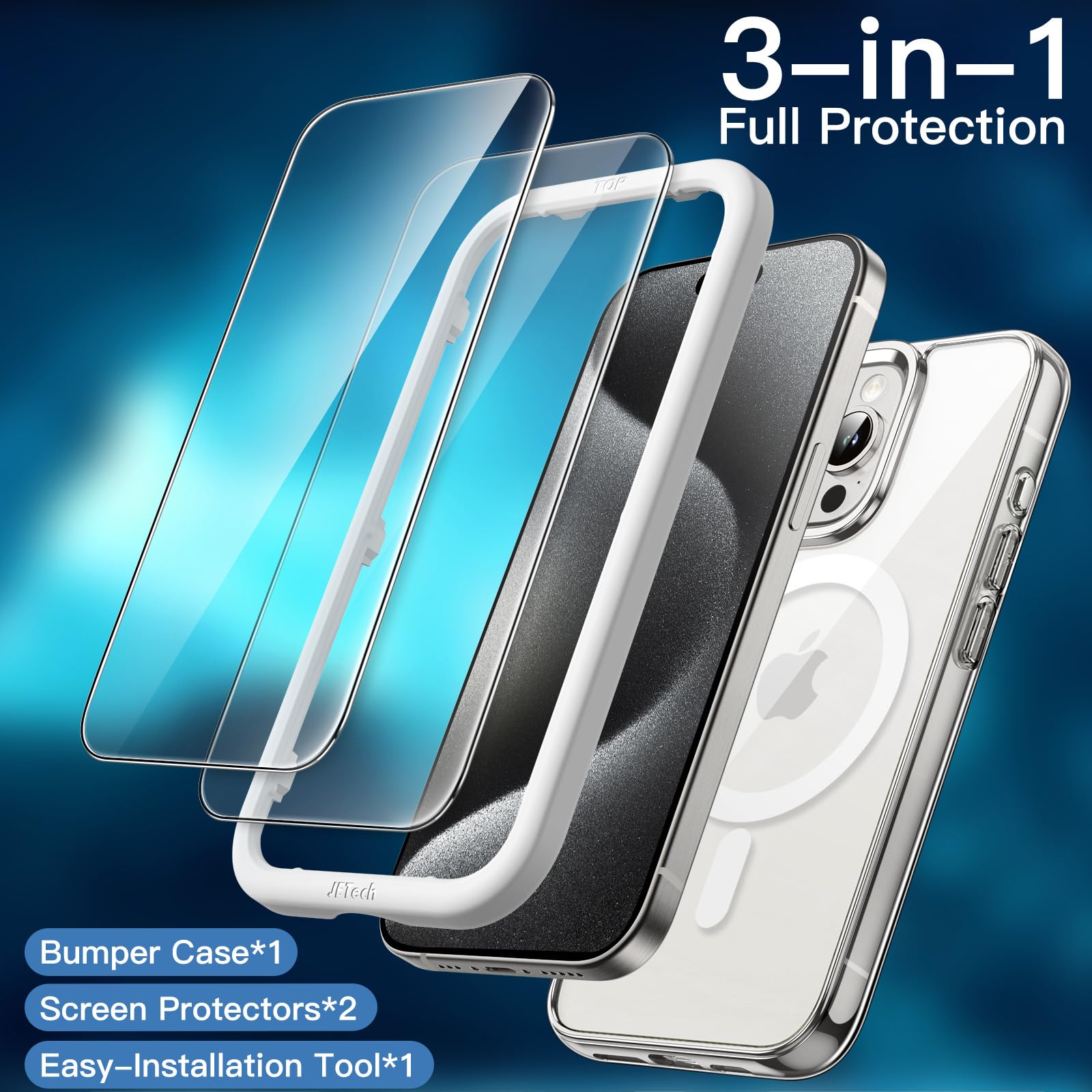 8 reviews for JETech 3 in 1 Magnetic Case for iPhone 15 Pro 6.1-Inch with 2 Pack Tempered Glass Screen Protectors, Compatible with MagSafe, Shockproof Bumper Phone Cover