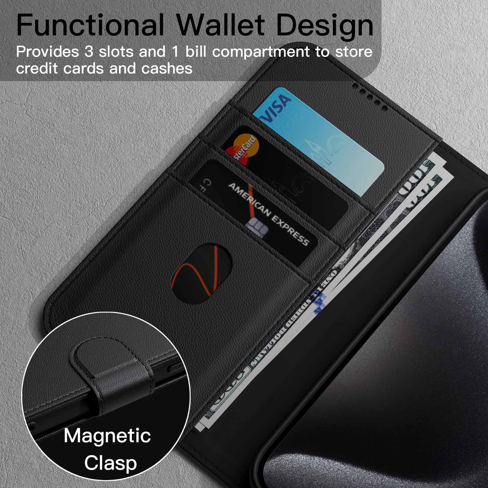 [Keep Security] The stronger magnetic clasp holds your phone and cards in a closed position. No need to worry the cards and money will fall off. Keep your belongings secure