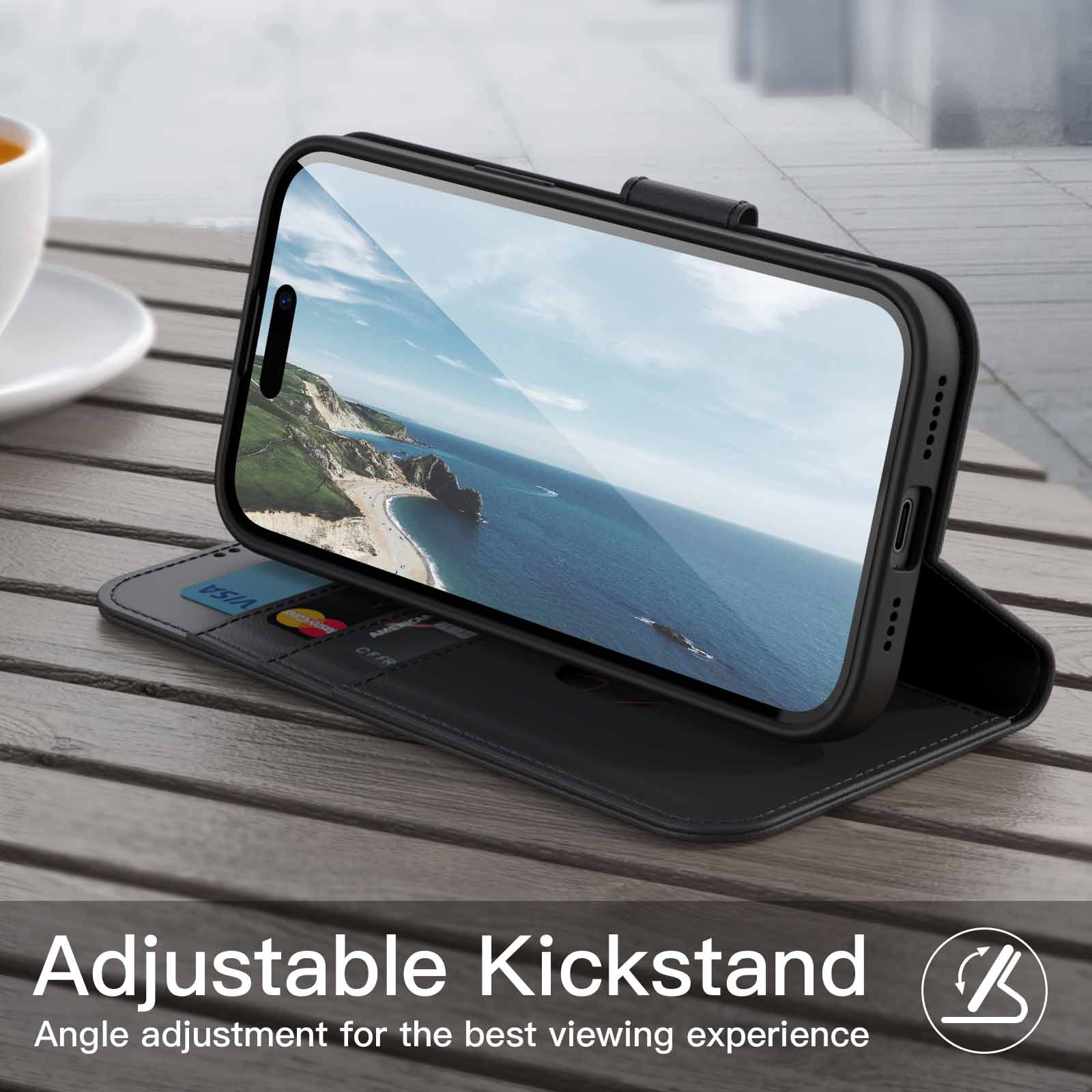 The JETech Wallet Case for iPhone 15 Pro Max 6.7-Inch. Shockproof PU Leather Magnetic Flip Cover with Card Holder. Stand Feature and Full Camera Protection (Black Titanium). comes well packaged as seen above..I love phone cases! They’re so much fun to accessorize with..The Jetech Wallet case for Iphone 15 pro max offers more than your average case. The wallet like design provides piece of mind. We’ve all had those moments where we’ve accidentally dropped our phones. The great thing about this phone case is that it not only protects the back of your phone but also the front screen. The corners of the case are reinforced with cushions to offer added protection..The Jetech wallet case has a gate fold design and opens up to reveal 3 cars slots for Id or credit cards. There is an inner sleeve below the card slots to put money in. Best of all when the case is closed. there’s a magnetic clip that keeps the case closed..The phone case offers an adjustable kickstand. allowing for hands free viewing. The Jetech wallet case also supports wireless charging..Given the excellent price point and the myriad of features the Jetech Wallet case offer’s. this is a great buy!.Recommended.