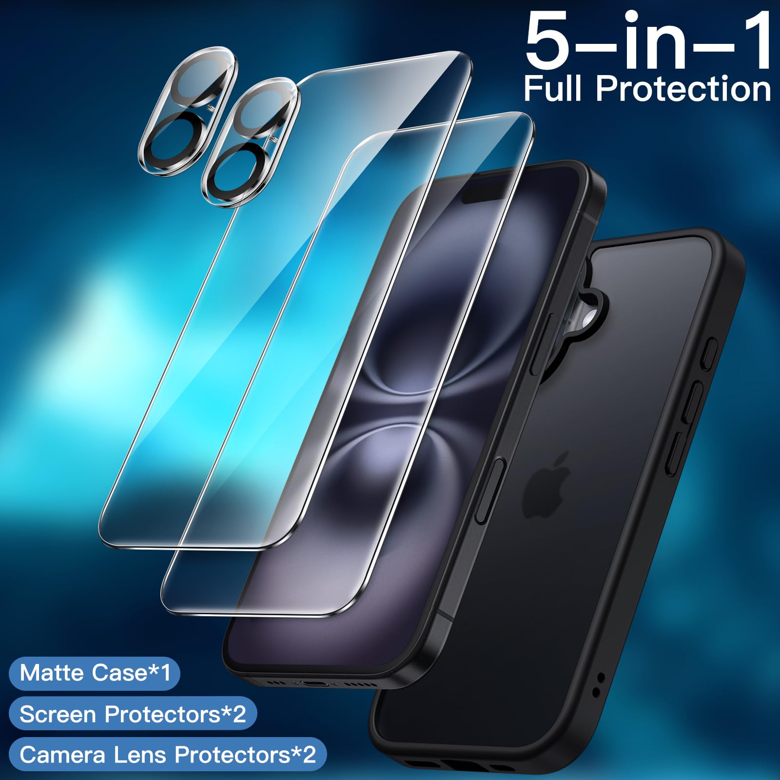 [5-in-1 Full Protection] There are 2 pack screen protectors with an alignment tool, 2 pack camera lens protectors and a matte case, providing all-around protection for your phone. Easy installation with included accessory kits