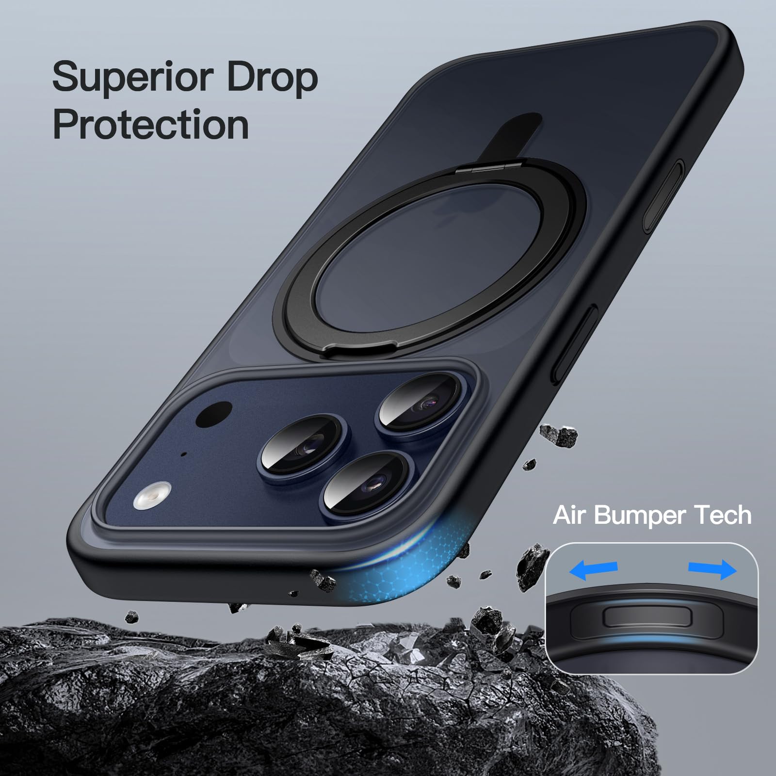 [360 Degree Rotatable Ring Stand] The case has 360 degree rotatable ring stand that prop up various vertical and horizontal positions and you can adjust the angle as per your daily needs. Meanwhile, the rotatable ring stand undergoes over 3000 open/close tests throughout the manufacturing process to provide you with quality assurance