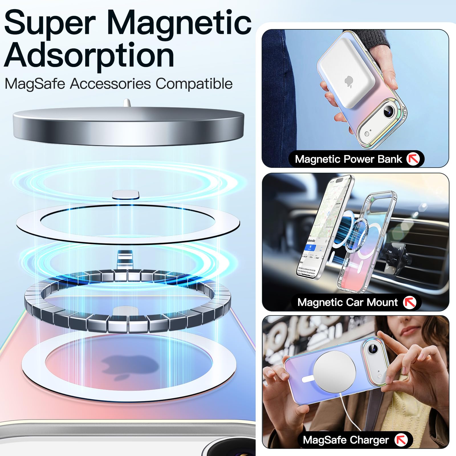 • [Super Magnetic Adsorption] Attach to the charger magnetically and strongly. Once snap on, never sliding. Compatible with MagSafe accessories, such as wallet, ring holder and power bank
