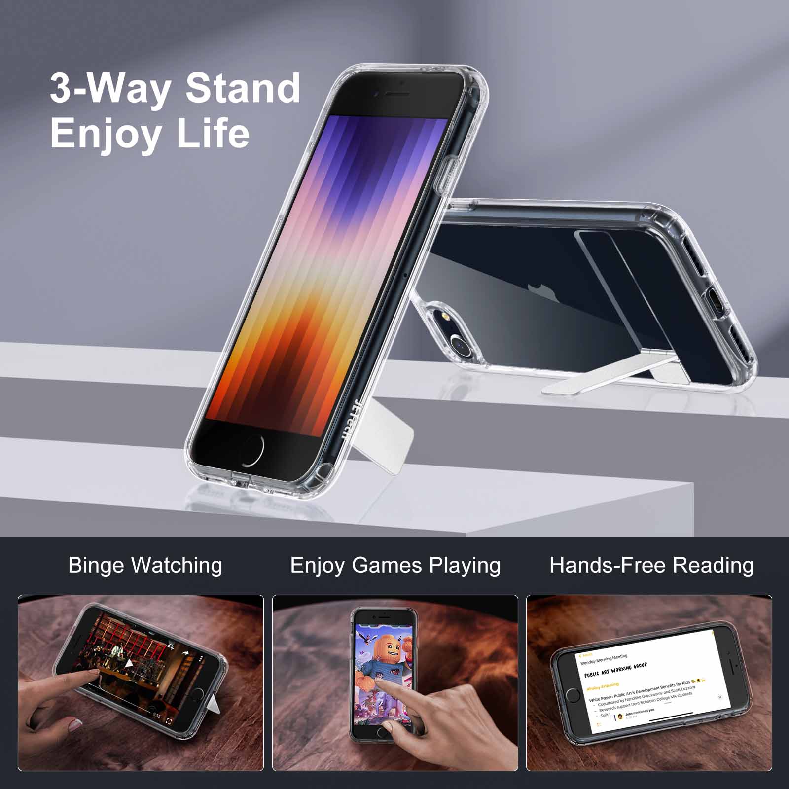[Free Hands, Enjoy Life] Prop up your phone stably in three ways. The adjustable design gives you an excellent viewing angle anytime and anywhere. Free your hands in enjoying chatting and reading
