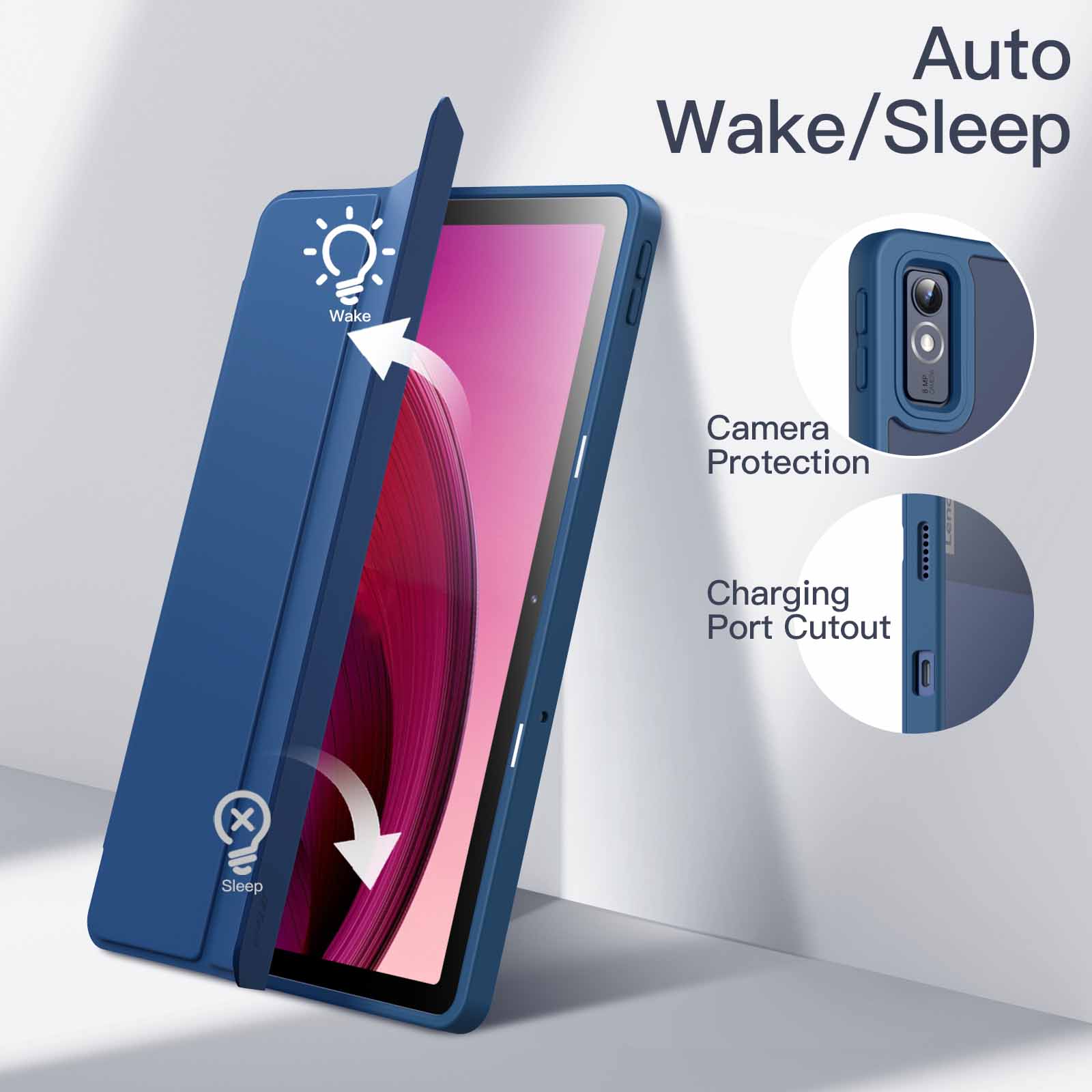 [Auto Wake/Sleep] This protective case with built-in magnets supports automatic sleep/wake function. Wake on open and sleep on close. More energy-saving
