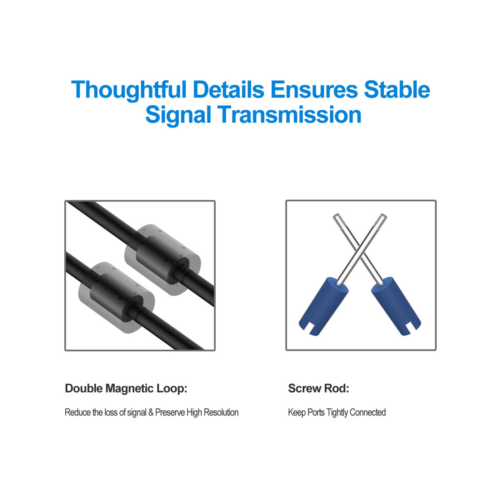 The VGA cord engineered with molded strain relief connectors for durability, grip treads for easy plugging and unplugging, and finger-tightened screws for a secure connection
